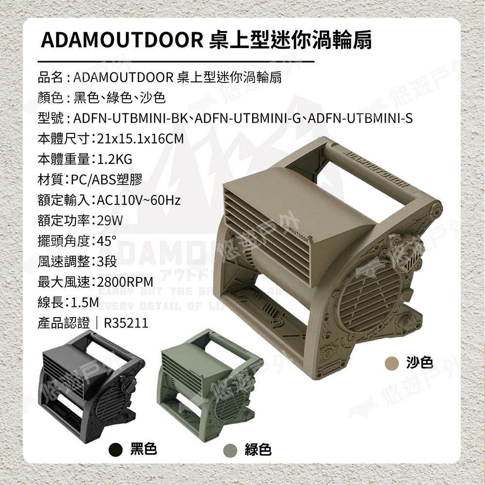【悠遊戶外】ADAMOUTDOOR 桌上型迷你渦輪扇 黑/沙/綠