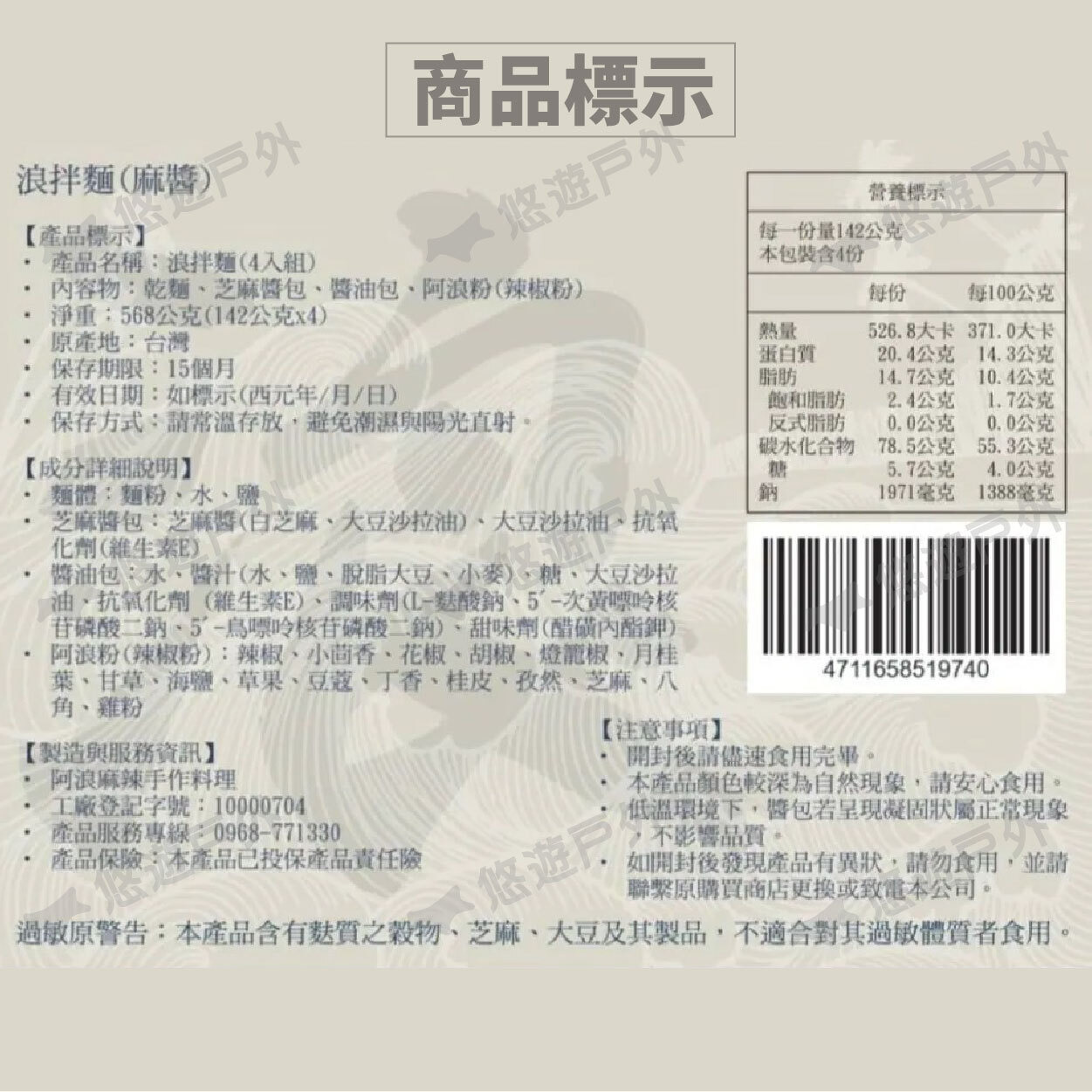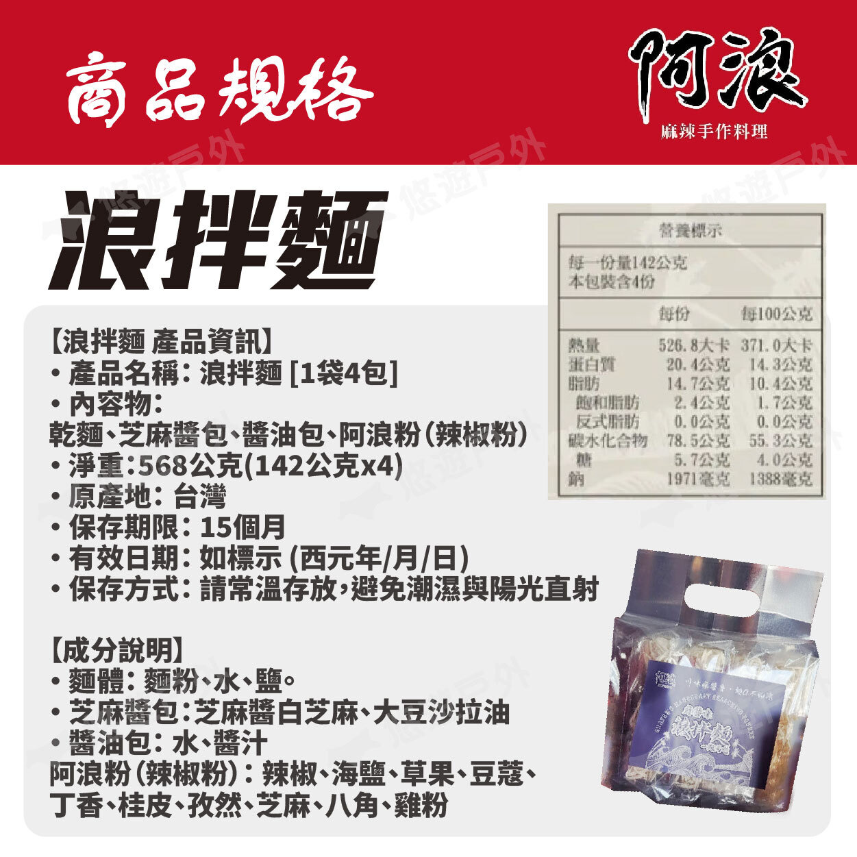 【悠遊戶外】阿浪-麻辣手作麻辣料理 麻辣手作-浪拌麵(4包/袋)