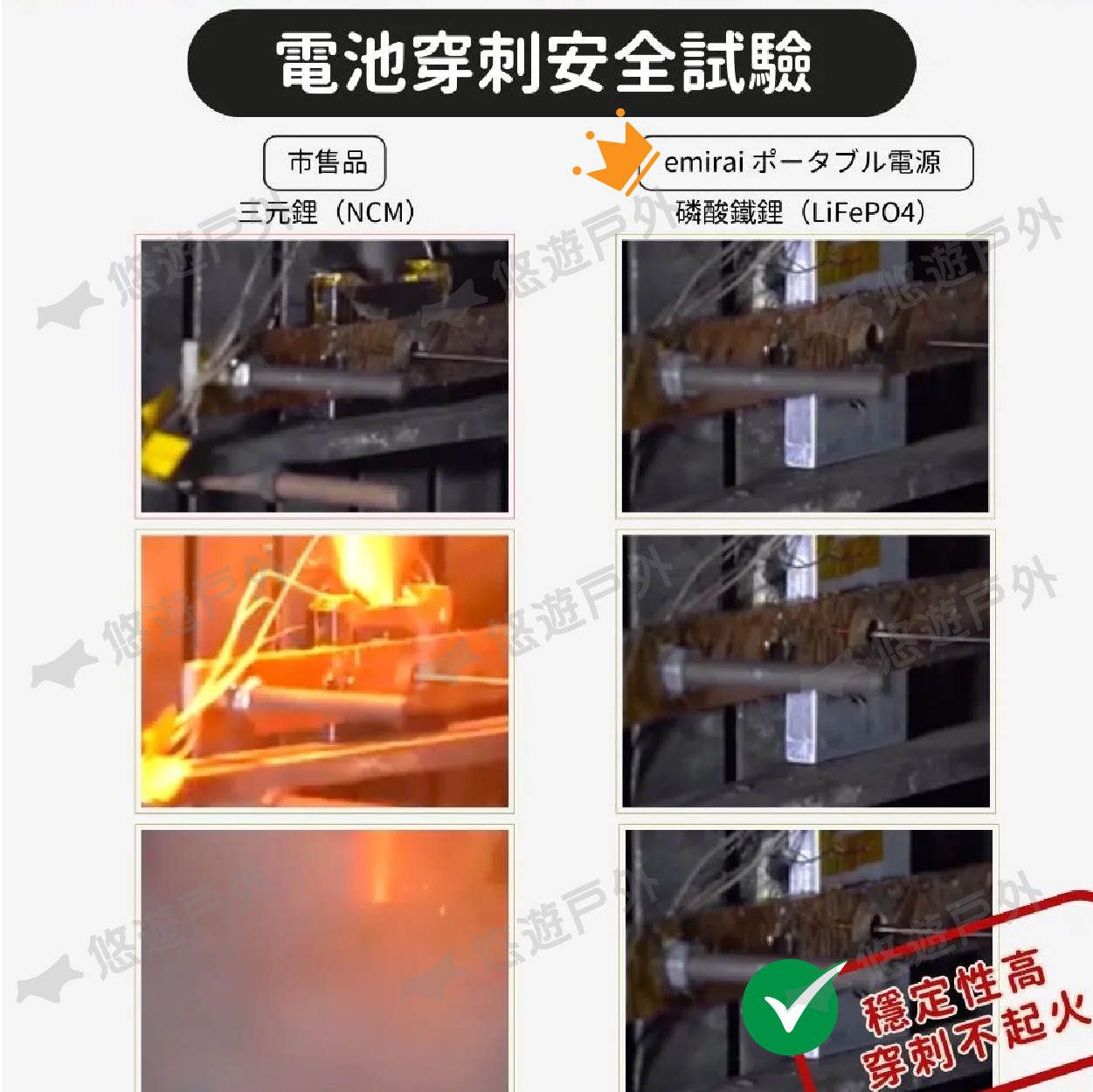 A:EMR310採用磷酸鐵鋰電芯 (LiFePO4),安全耐高溫,穿刺不起火,