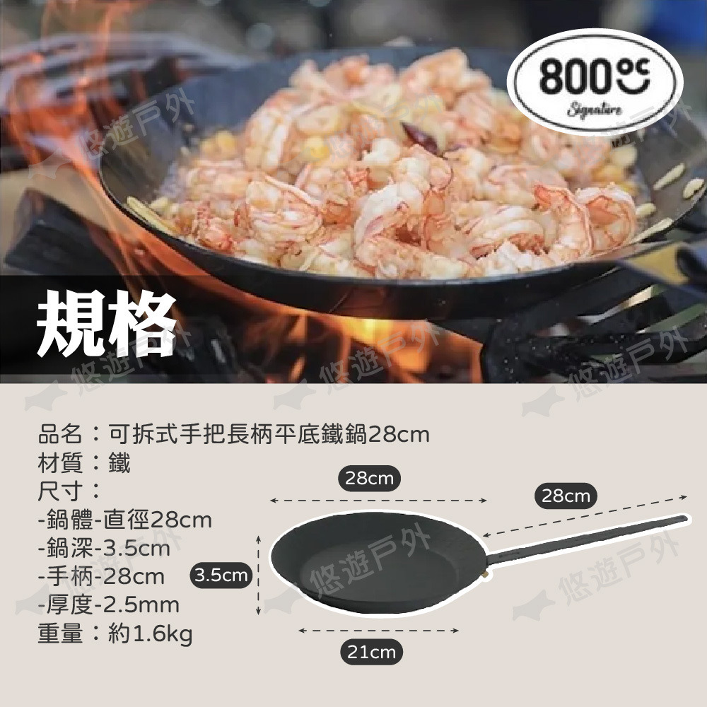 【悠遊戶外】韓國800度C 可拆式手把長柄平底鐵鍋28cm