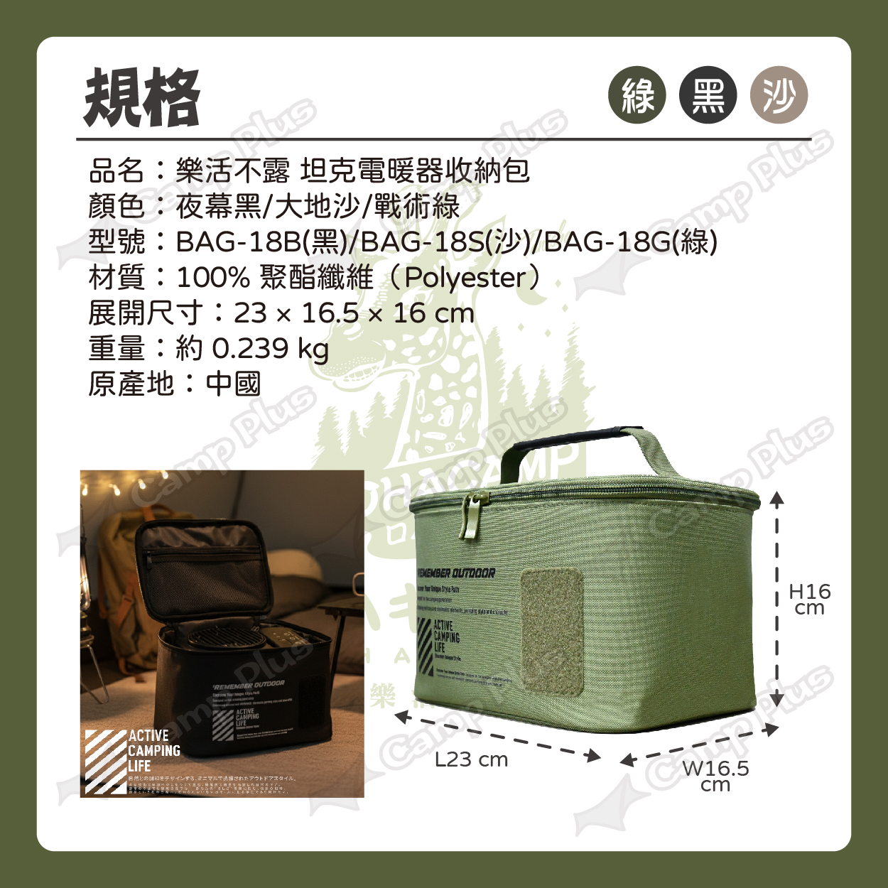型號:BAG-18B(黑)/BAG-18S(沙)/BAG-18G(綠)