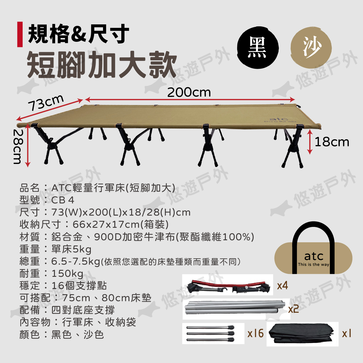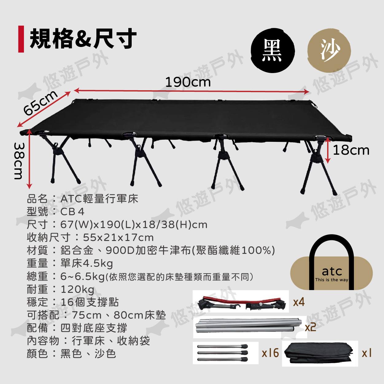【ATC】輕量行軍床組合賣場 CB4 單床/加大款75cm.80cm專用床墊/套組 黑沙 露營床 高架床 露營 悠遊戶外