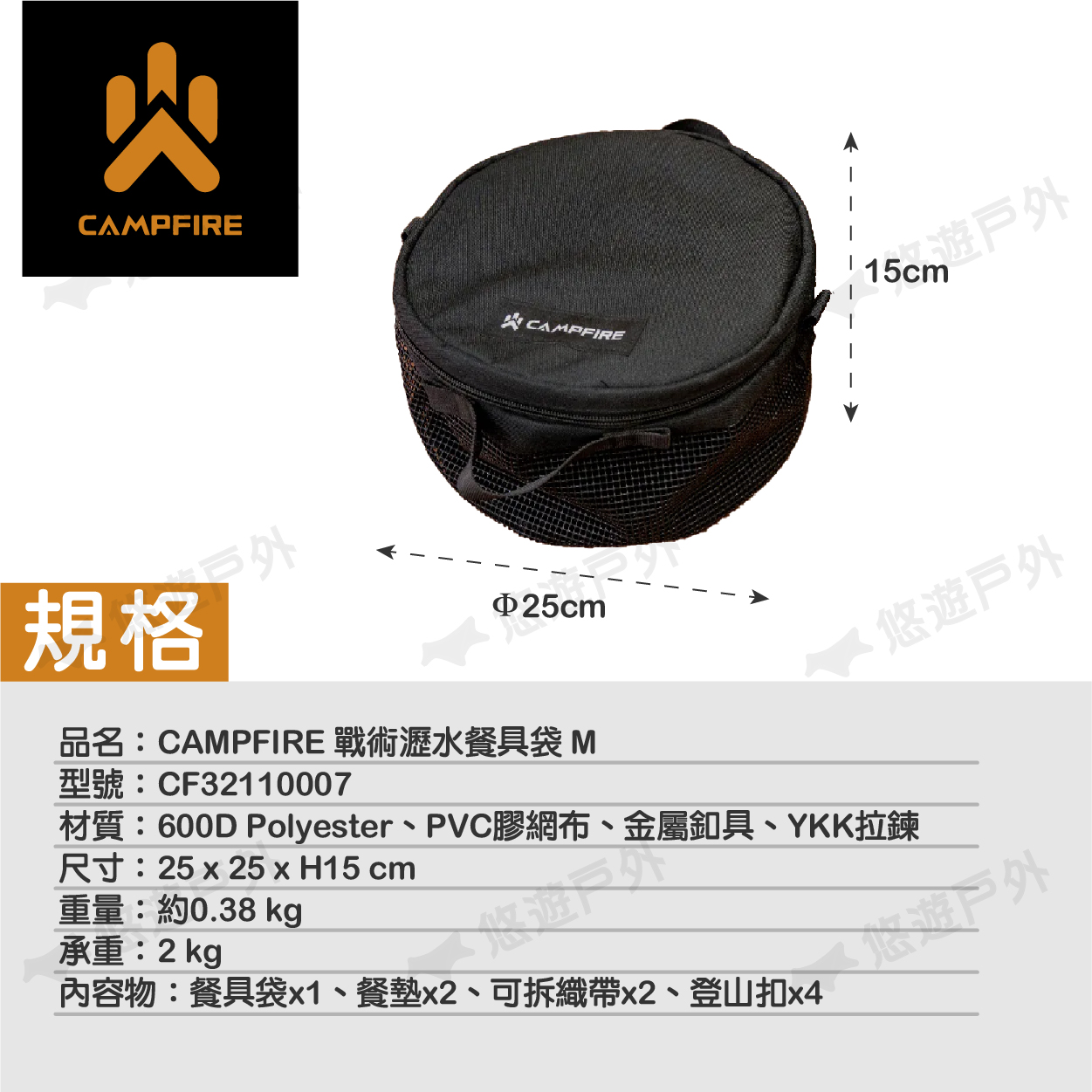 內容物:餐具袋x1、餐墊x2、可拆織帶x2、登山扣x4