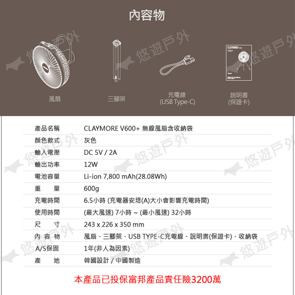 產品名稱:CLAYMORE V600+無線風扇含收納袋