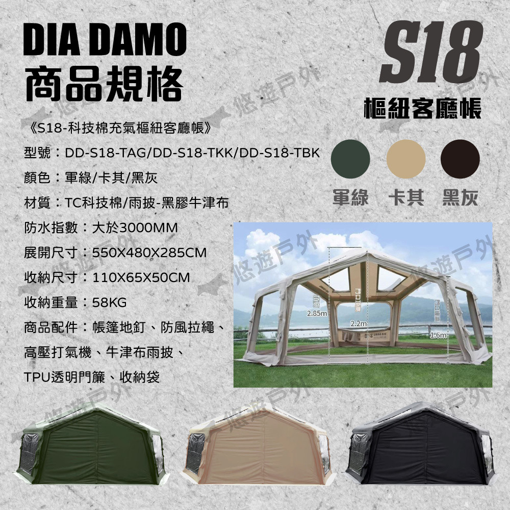 【悠遊戶外】迪達蒙 S18 科技棉充氣樞紐帳-卡其/軍綠/黑灰