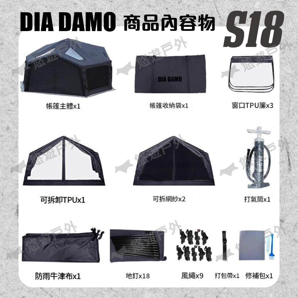 商品配件:帳篷地釘、防風拉繩、高壓打氣筒、牛津布雨披、TPU透明門簾、收納袋
