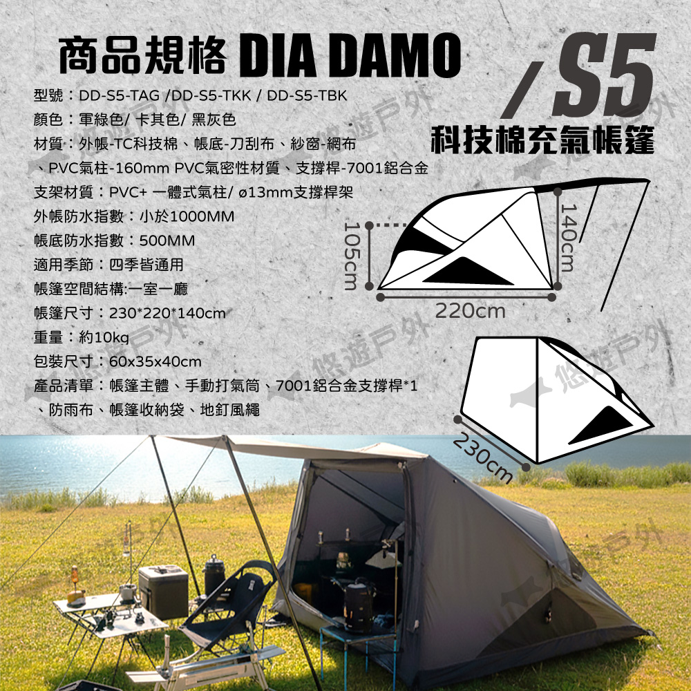 【DIA DAMO迪達蒙】S5 充氣帳篷 三色 TC科技棉 1-2人 車露帳 單層帳 雙人帳 機車露營 登山 悠遊戶外