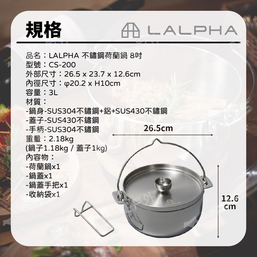 【LALPHA】不鏽鋼荷蘭鍋8吋 CS-200 三層不鏽鋼鍋 3L 鍋具 烹飪 野炊 露營 附收納袋 鍋蓋手把 悠遊戶外