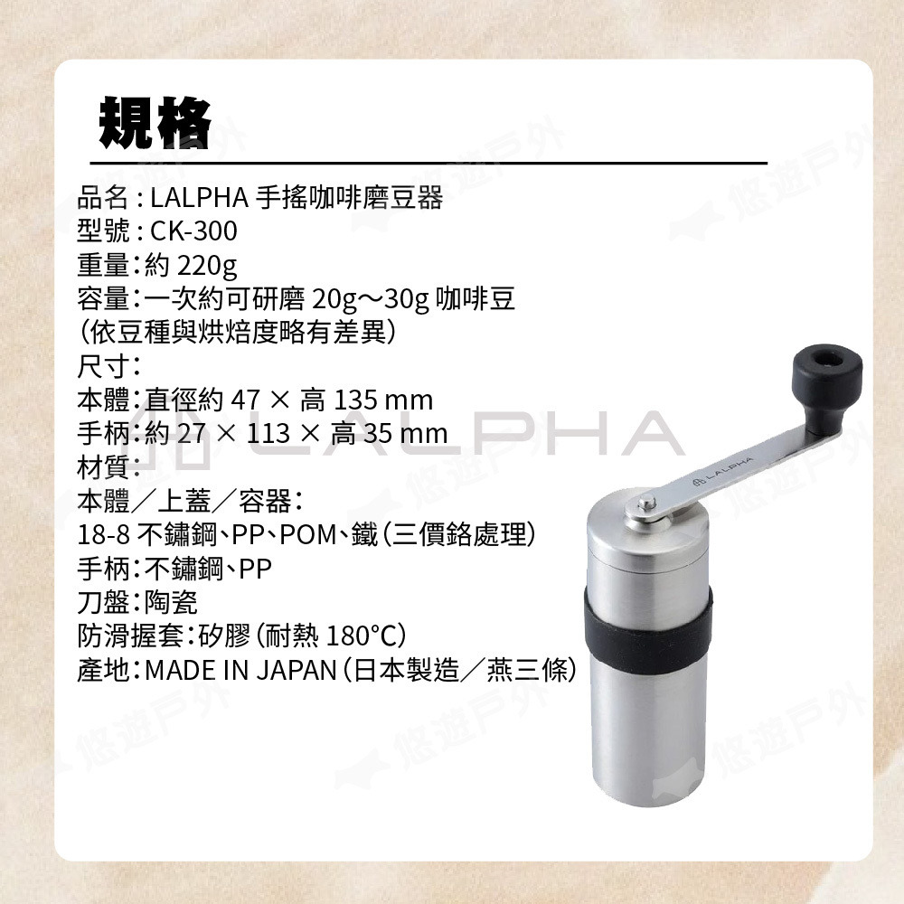 【LALPHA】手搖咖啡磨豆器 CK-300 陶瓷刀片 18-8不鏽鋼材質 手搖磨豆機 便攜磨豆機 登山 露營 悠遊戶外