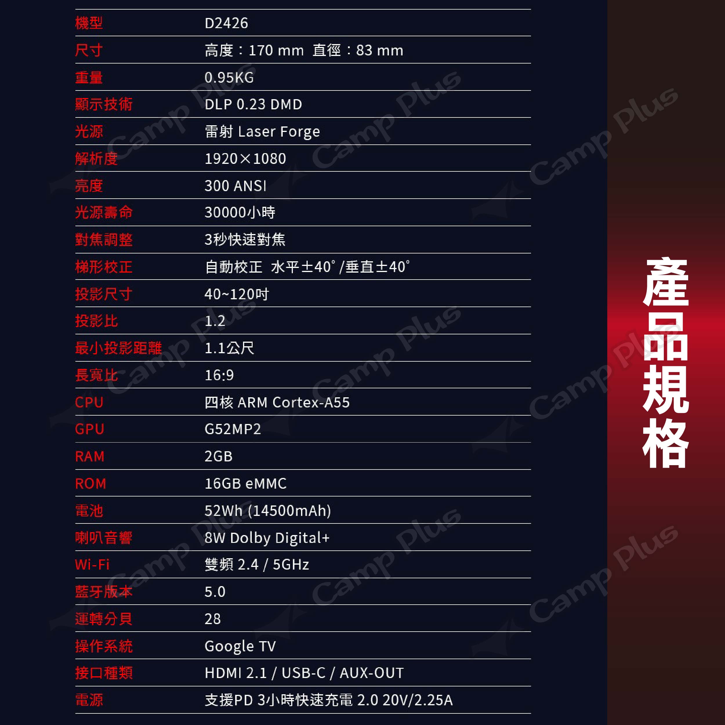 內容物:投影機主體/充電器/使用指南/USB-C充電線/搖控器/2×AAA電池