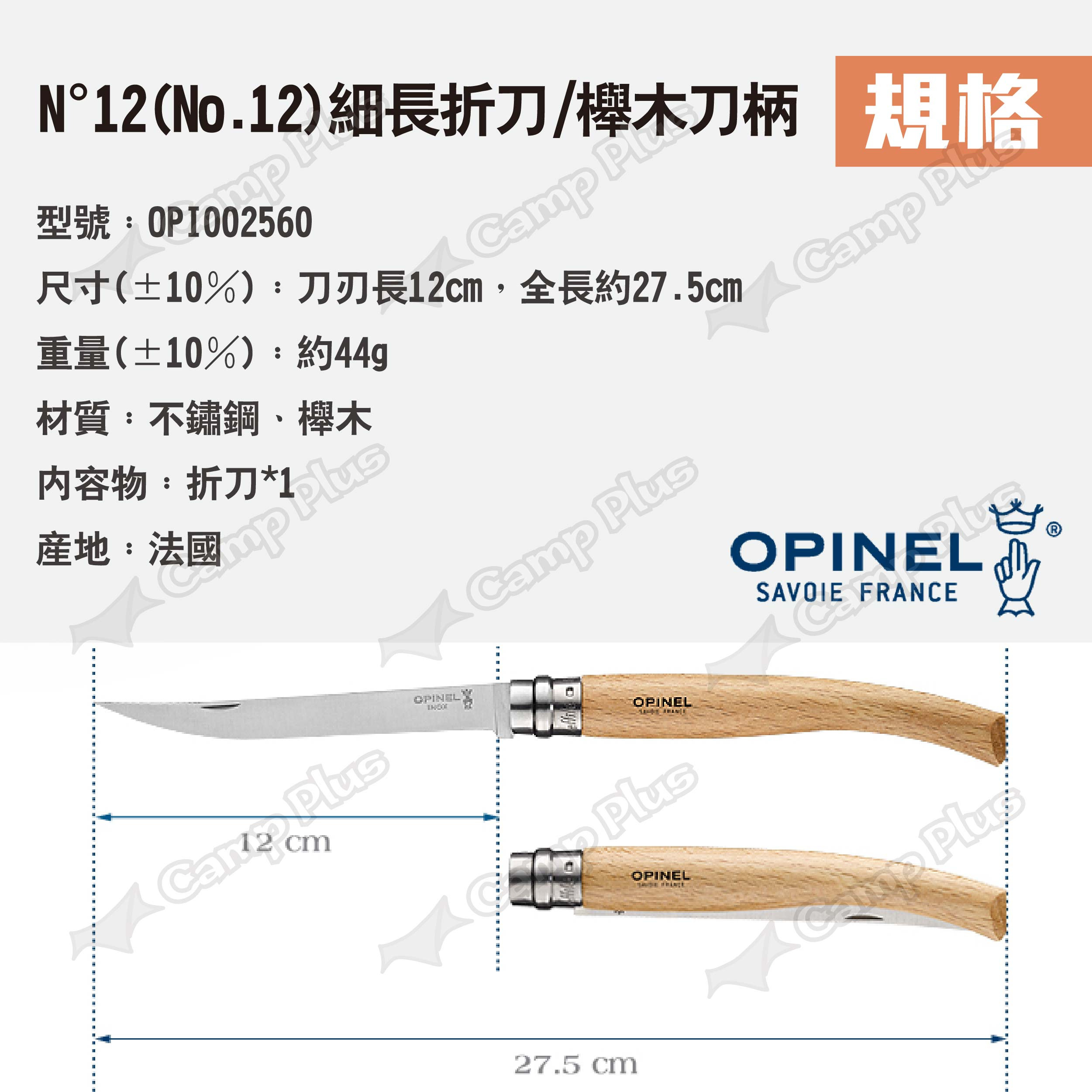 品名:OPINEL N°12(No.12)細長折刀-櫸木刀柄