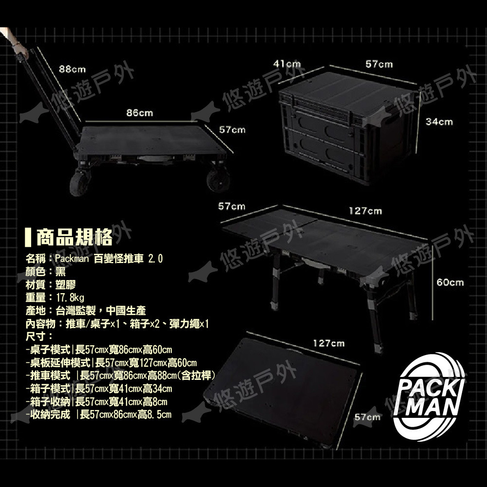 【Packman】百變怪推車 2.0 PK-08 黑色 桌子 露營車 收納箱 多功能推車 露營用具 野炊 露營 悠遊戶外